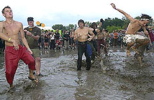 A Wan2 sátornál két hihetetlenül ittas ifjú legény hempereg a sárban, végtelen igénytelenségben. A fotósok lecsapnak a témára, mint rétisas az ürgére - a két önjelölt, sárral összekent bohóc pedig büszkén és zavaros szemmel néz a kamerába. Közben a Nagyszínpadnál a Sziámi zenél, de nem könnyű megközelíteni: több négyzetméteres, 5-10 centi mély tócsák, komoly pocsolyák közt tipegünk-topogunk, cuppogó, saras lábakkal, bizonytalanul csúszkálunk az iszapban. Müller rázendít egy komor, depressziós dalra, amely olyan, mint az időjárás. - Ha előrelátó csecsemő lettél volna, felkötöd magad a köldökzsinórodra! - énekli a Sziget egyik alapítója s a banda frontembere. Már-már borongós rosszkedv lenne rajtunk úrrá, de ekkor elballag mellettünk a Nap Nője, így ismét kacagó, nyári napsugár váltja fel a szívükre telepedett hervasztó sötétséget.
